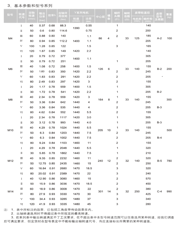 1.1本系列減速機(jī)二級(jí)減速傳動(dòng)機(jī)構(gòu),一級(jí)為帶傳動(dòng),第二級(jí)為阿基米德圓柱蝸桿蝸輪傳動(dòng)。其特點(diǎn)有:結(jié)構(gòu)緊湊傳動(dòng)比大、工作平穩(wěn)可靠、無噪音、在蝸桿螺線導(dǎo)程角小的情況下減速機(jī)還具有自鎖性。