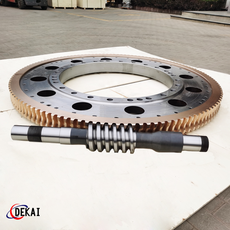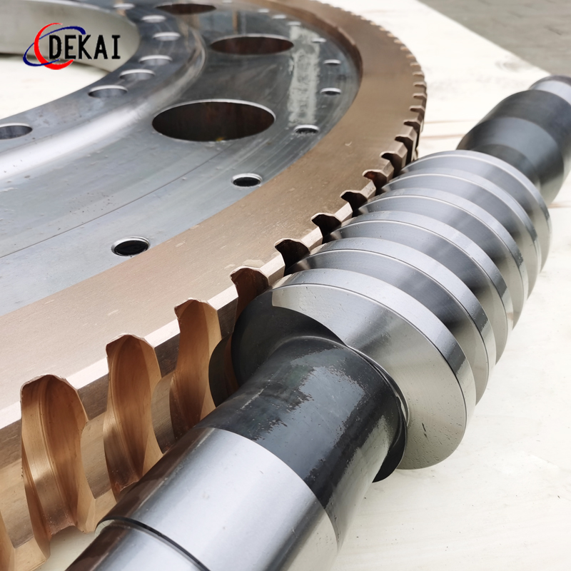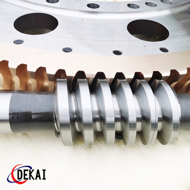 德州德凱減速傳動機械有限公司采用雙蝸桿對消隙原理開發(fā)生產(chǎn)的精密蝸輪蝸桿副,主要用于大型機床工作臺的驅(qū)動,高精密分割器等無間隙圓周運動精確定位場合。該蝸輪副中心距最大可做到2000mm,單節(jié)速比可做到1-365同時不產(chǎn)生回程間隙。